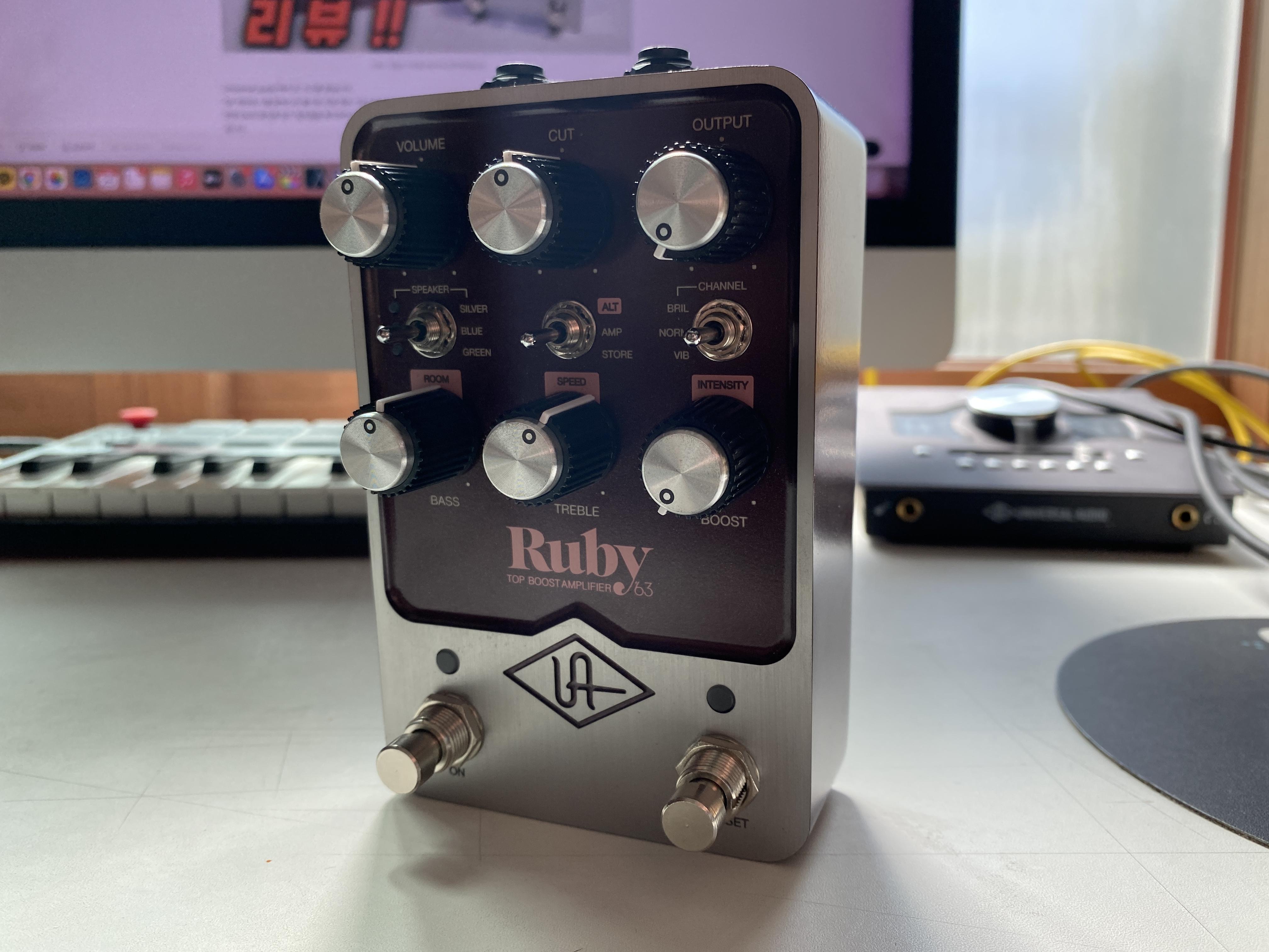 Ruby63 페달은 영국산 명기 앰프 Vox AC30 63년산 앰프를 복각한 페달인데요. 이 복각이라고 함이 옛날에 출시한 페달들 이라면 앰프의 특색만을 가져왔다 한다면 UAFX는 앰프가 캐비넷을 통해 마이크로 넘어가는 외곡된 소리를 정교하게 복각했다고 생각하시면 될거 같은데요. 그 정교함이 어느 정도냐 하면 앰프에서 나오는 잡음과 배음, 심지어 디테일한 울림까지 표현했습니다. 이런 리얼한 사운드는 기타 연주자에겐 너무 반가운 장비 인데요. 기존에 있던 많은 레코딩 장비들은 디지털 사운드에 갇혀 생생한 소리를 만드는데에 약간의 부족함이 있었는데 Ruby63과 Dream65는 악기의 생동감을 그대로 살려 우리가 실제 음악에서 듣는 외곡된 기타 소리를 내 작업실에서 이 페달 하나로 연주가 가능하다고 보시면 되겠습니다